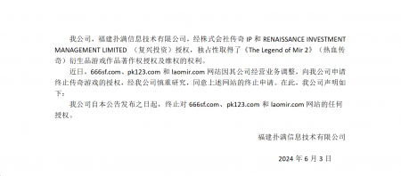 202406-03好体育官方网站下载信息技术有限公司(以下简称“我司”)经株式会社传奇IP 、RENAISSANCE INVESTMENT MANAGEMENT LIMITED (复兴投资...