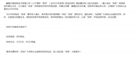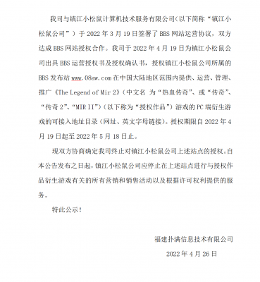 202204-26好体育官方网站下载信息技术有限公司(以下简称“我司”)自2021年获得《热血传奇》原始著作权人独占性授权,一直...